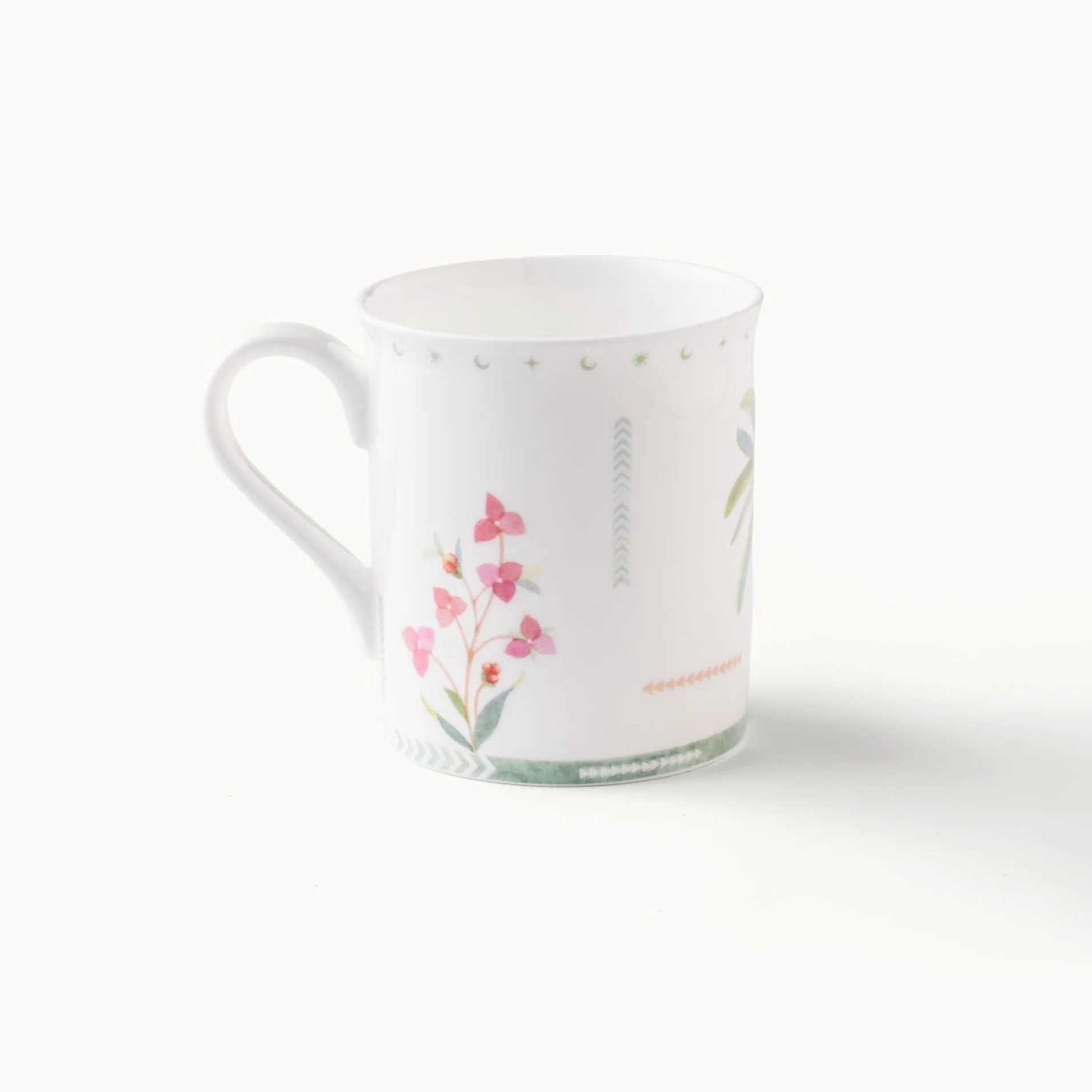 Elegant ceramic mug with floral motifs, geometric accents, and refined detailing for serene everyday coffee and tea moments.