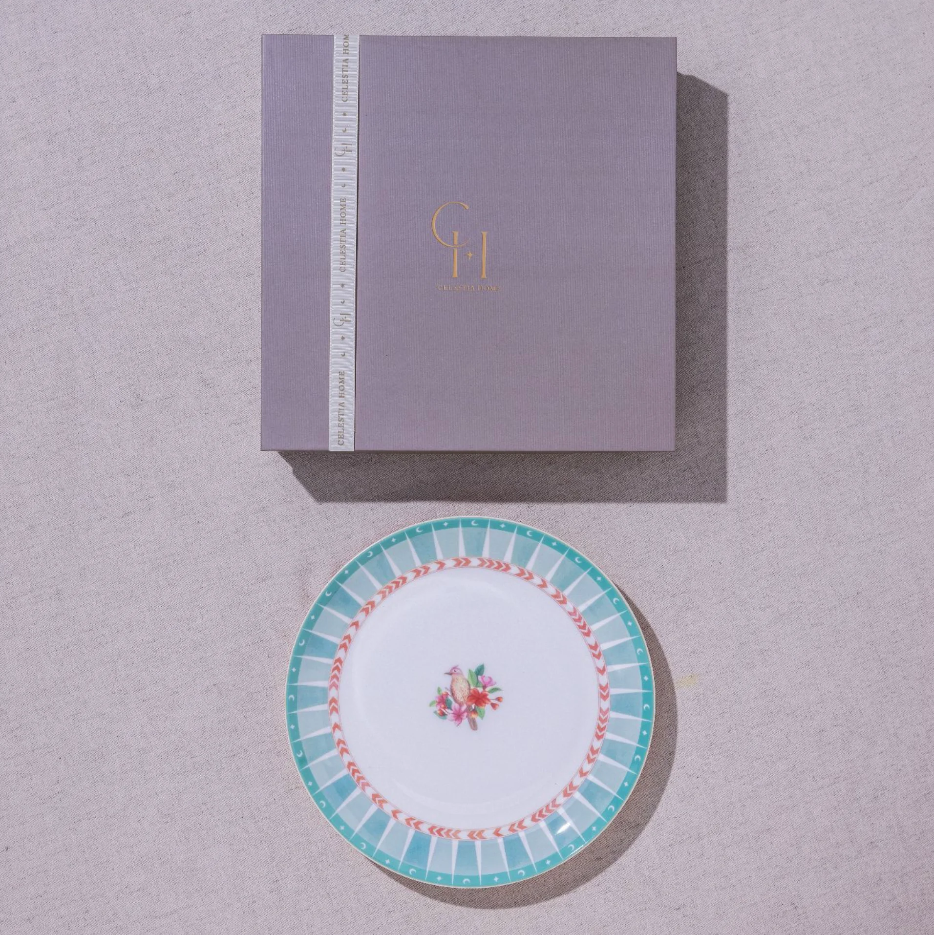 This exquisite Dinner Plate features the graceful American Goldfinch surrounded by delicate florals and Celestia Home’s signature celestial accents, all illustrated in a serene, watercolor-inspired palette. Subtle geometric and chevron motifs add a touch of modern sophistication, blending seamlessly with the plate’s poetic elegance to bring effortless beauty to your table.