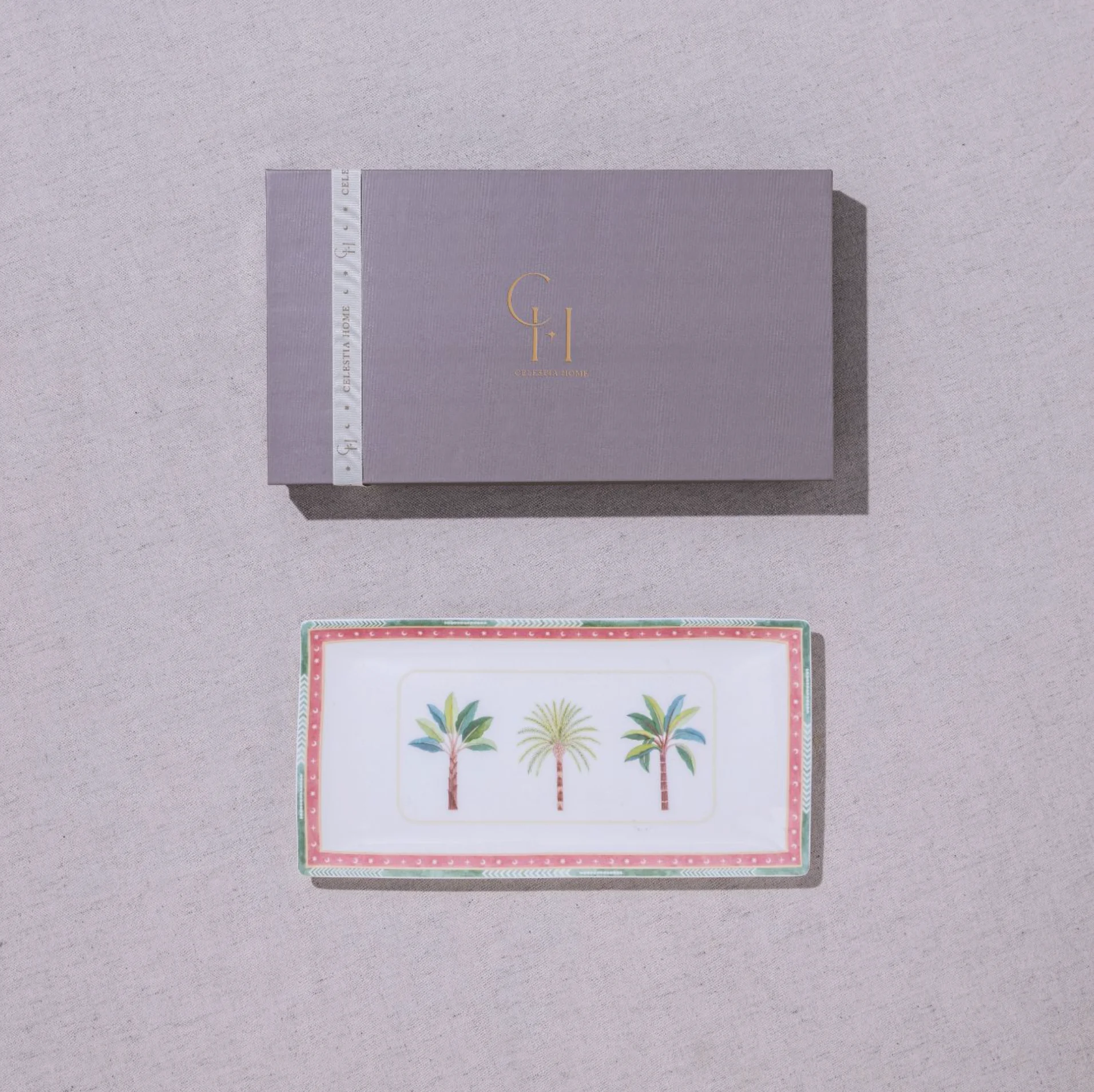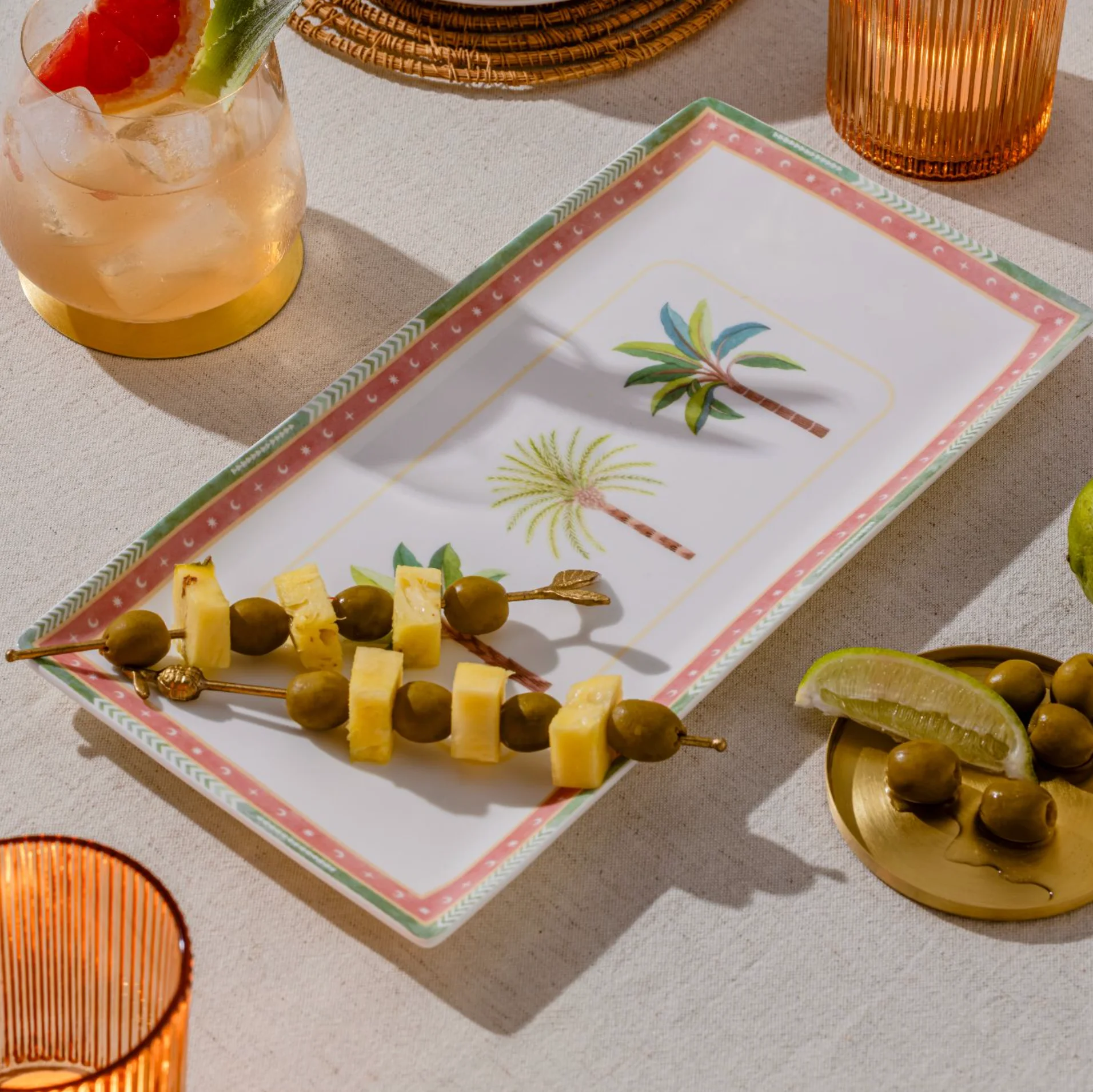 Elegant rectangular platter with flowing palm motifs and refined detailing for graceful, elevated serving.